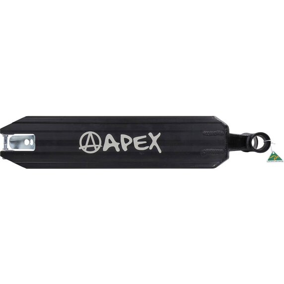 Apex Pro Scooter Deck je deska nejvyšší úrovně od Apex z Austrálie. Vyrobeno z tepelně opracovaného T6 hliníku, obroušeného CNC stroji a upravené laserovým gravírováním. Všechny tyto elementy se spojují do silné, odolné a na detail přesné desky. Nechybí raily pro grindování, flat sides pro finger Whip a extra místo pro nohy kvůli speciálnímu designu krku desky.