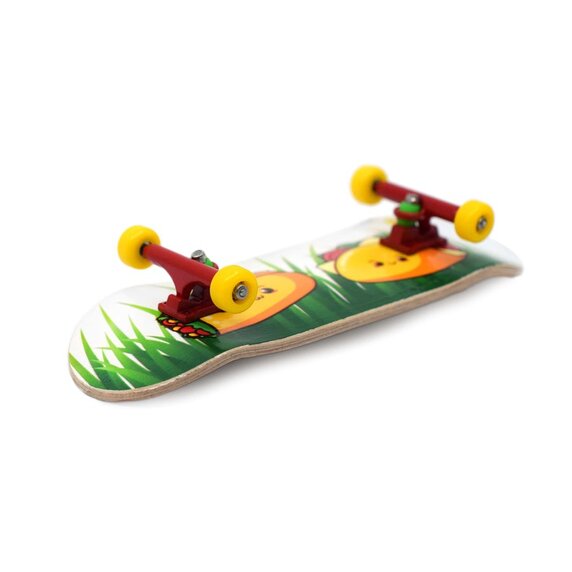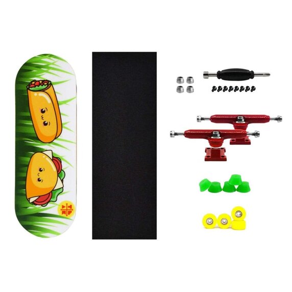 Teak Tuning Happy Tacos je prémiová fingerboard s grafikou vytvořenou pomocí přenosu tepla. Happy Tacos edice obsahuje PROlific Maple desku se skutečnou kvalitou jako u velkého skateboardu. Grafika na fingerboardu se dokáže opravdu opotřebovat, tak jako byste na něm skutečně jezdili po překážkách a rampách. Na designu Happy Tacos najdeme kreslené tacos.